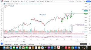 Friends Tata Steel 1 महीना पूरा 1 ही रेंज में ट्रेड किया है और अब जा के इसने मजबूत ब्रेकआउट दिया है और सबसे बड़ी बात यह है कि इस बार अपने पिछले लेवल को रीटेस्ट कर के अच्छे वॉल्यूम के साथ ब्रेकआउट दिया है |